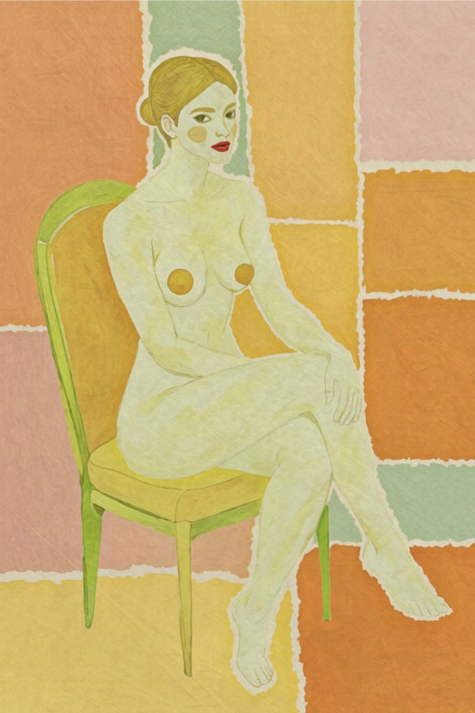 Este desnudo inspirado en el arte pop combina la elegancia del dibujo clásico de figuras con la energía audaz del color blocking moderno. La protagonista, una mujer sentada y serena, irradia confianza y calma, y su figura está representada con suaves pinceladas perfiladas con nítidas líneas negras. Su piel tiene un tono cálido y dorado que armoniza a la perfección con la paleta de colores vivos del fondo: divertidos bloques de naranja, rosa, amarillo y verde que evocan la estética retro de mediados de siglo.