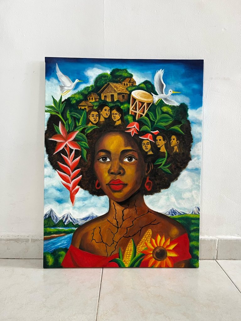 Hace alusión directa a la raíz afrocolombiana, al territorio libre, al orgullo de ser quien se es.Una mujer afrocolombiana que expresa serenidad y fuerza, su cabello es un universo del cual emergen casas de palenque, tamboras, Flor de plátano, aves del caribe, fragmentos de río y rostros de otras mujeres. Su cuerpo esta formado por la tierra misma con grietas que brotan oro, maíz y semillas. Sus ojos miran de frente firmes como diciendo «Aquí estoy, vengo de la raíz y del Tambor» ella representa a todas las mujeres afro de colombia: portadoras de sabiduría, canto, resistencia, crianza, alegría y lucha. Detrás de ella un paisaje que recuerda a san Basilio de palenque o cualquier costa del pacífico atlántico, pero ligeramente onírico como si rstuviera todo flotando entre la bruma del tiempo y la memoria.