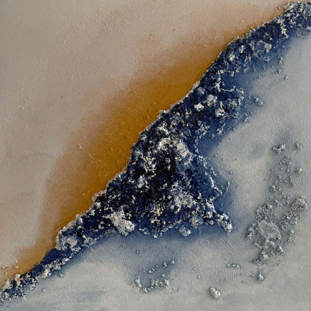 Las texturas emergen como un paisaje interior. Azules profundos, arenas suaves y una cálida huella que recorre la superficie, creando equilibrio y contraste. La pieza invita al espectador a detenerse, a observar los detalles y a explorarla en silencio con la mirada.